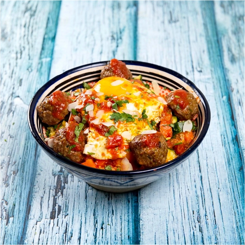 Een luchtige, gestoomde couscous, subtiel gekruid, geserveerd met een gebakken ei in olijfolie. Daarbij sappige lamsgehaktballetjes en een rijke mix van verse groenten zoals courgette, pompoen, wortel, wittekool en zoete aardappel. De groenten variëren met de seizoenen0