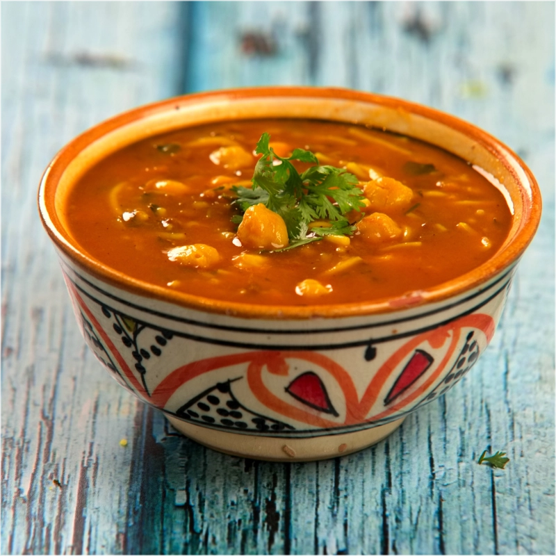 Harira, een voedzame en verwarmende Marokkaanse soep met tomaten, kikkererwten, linzen en kruiden. Verkrijgbaar als vegetarische optie of met vlees of kip. Gekenmerkt door zijn rijke smaak en vullende eigenschappen, geserveerd met brood en ideaal met dadels0